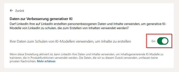 ▶ Die erfolgt über „Einstellungen -> Datenschutz -> So verwendet LinkedIn Ihre Daten -> Daten zur Verbesserung generativer KI“ und dauert nur einen Wimpernschlag.